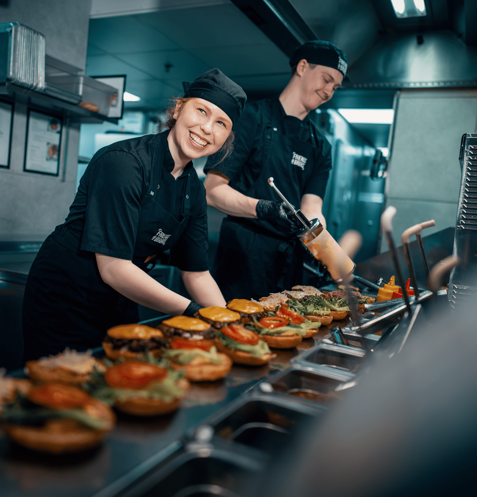 Meillä työntekijät saavat opetella tekemään kaikkia työtehtäviä keittiön sekä salin puolella. Työtehtäviin kuuluu mm. asiakaspalvelu kassalla, raaka-aineiden esivalmistaminen, leipien leipominen ja tietenkin hampurilaisten valmistus. Työ on hyvin vaihtelevaa ja jokainen työpäivä näyttää erilaiselta!